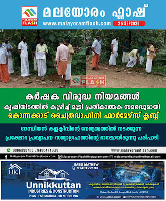 പാർലമെൻ്റ് പാസ്സാക്കിയ കാർഷിക ബില്ലുകൾ കൃഷിയിടത്തിൽ കുഴിച്ചുമൂടുന്ന സമരത്തിൻ്റെ ഭാഗമായി കൊന്നക്കാട് ചൈത്രവാഹിനി കർഷക ക്ലബ്ബ് നേതൃത്വത്തിൽ വിവാദ ബില്ലുകൾ പ്രതീകാത്മകമായി കൃഷിയിടത്തിൽ കുഴിച്ചു മൂടി. സംസ്ഥാനത്തെ വിവിധ സ്വതന്ത്ര കർഷക സംഘടനകൾ വിവിധ കേന്ദ്രങ്ങളിൽ നടത്തുന്ന സമരത്തിൻ്റെ ഭാഗമായാണ് പരിപാടി നടന്നത്.