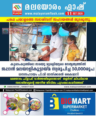 രോഗത്തോട് മല്ലടിച്ച് ജീവിക്കുന്ന സദാശിവേട്ടൻ്റെ ദയനീയ ചിത്രം മലയോരം ഫ്ലാഷിലൂടെ കണ്ട് സഹായഹസ്തവുമായി മുന്നോട്ട് വന്ന ജപ്പാനിൽ ജോലി ചെയ്യുന്ന കൂരാംകുണ്ട് സ്വദേശി സരയൂ മുരളി എന്ന നന്മ മനസ്സിൻ്റെ മനുഷ്യത്വപരമായ ഇടപെടൽ സദാശിവേട്ടൻ്റെ ജീവിതത്തിന് വലിയ കൈത്താങ്ങായി. ഇവരുടെ നേതൃത്വത്തിൽ ജപ്പാൻ -മലയാളി കൂട്ടായ്മ സ്വരൂപിച്ച അൻപതിനായിരം രൂപയുടെ ധനസഹായം ഞായറാഴ്ച്ച കൈമാറി. കൂട്ടായ്മക്ക് വേണ്ടി കക്കയം ചാമുണ്ഡേശ്വരി ദേവി ക്ഷേത്രം പ്രസിഡണ്ട് പി.വി ഭാസ്ക്കരൻ സദാശിവൻ്റെ വീട്ടിലെത്തി സഹായധനം കൈമാറി.