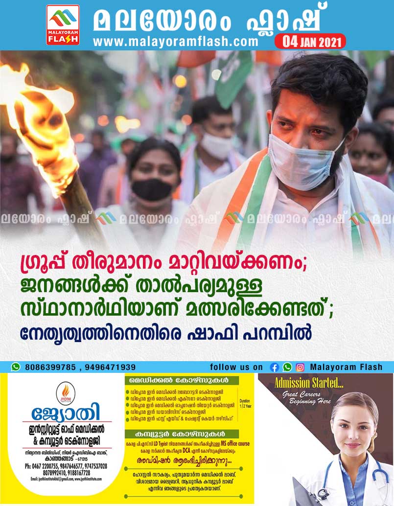 ഗ്രൂപ്പ് തീരുമാനം മാറ്റിവയ്ക്കണം; ജനങ്ങള്ക്ക് താല്പര്യമുള്ള സ്ഥാനാര്ഥിയാണ് മത്സരിക്കേണ്ടത്'; നേതൃത്വത്തിനെതിരെ ഷാഫി പറമ്പില്