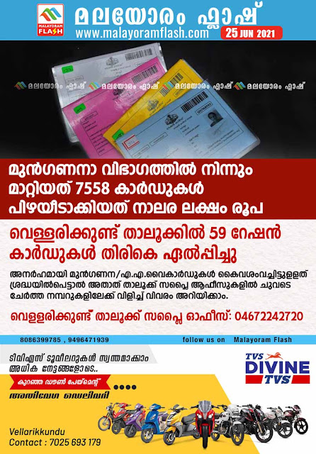 2018 ജൂലായ് 27 മുതല് 2021 ജൂണ് 24വരെ 7558 റേഷന് കാര്ഡുകള് മുന്ഗണനാ വിഭാഗത്തില് നിന്നും മാറ്റിയിട്ടുണ്ട്്. പിഴയില്ലാതെ കാര്ഡ് തിരികെ ഏല്പ്പിക്കാന് സമയം അനുവദിച്ച് സര്ക്കാര് ഉത്തരവിറക്കിയതിന് ശേഷം 469 പേരാണ് കാര്ഡ് തിരികെ ഏല്പ്പിച്ചത്. കാസര്കോട് താലൂക്കില് 143 കാര്ഡുകളും ഹൊസ്ദുര്ഗില് 158, മഞ്ചേശ്വരത്ത് 109, വെള്ളരിക്കുണ്ട് താലൂക്കില് 59 റേഷന് കാര്ഡുകളും തിരികെ ഏല്പ്പിച്ചു.