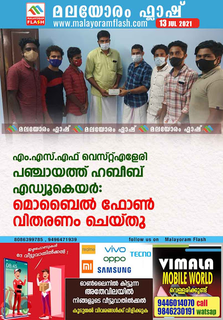 കുന്നുംകൈ: വെസ്റ്റ് എളേരി പഞ്ചായത്തിലെ നിർധനരായ വിദ്യാർത്ഥികൾക്ക് വെസ്റ്റ്എളേരി പഞ്ചായത്ത് എം.എസ്.എഫ് കമ്മിറ്റി ഹബീബ് എഡ്യൂകെയർ പദ്ധതിയിൽ ഉൾപ്പെടുത്തി മൊബൈൽ ഫോൺ വിതരണം ചെയ്തു. പഞ്ചായത്തിലെ 6 വിദ്യാർത്ഥികൾക്കാണ് മൊബൈൽ ഫോൺ നൽകിയത്. പെരുമ്പട്ട സ്കൂളിൽ നടന്ന പരിപാടിയിൽ പഞ്ചായത്ത് മുസ്ലിം ലീഗ് പ്രസിഡണ്ട് ജാതിയിൽ അസൈനാർ വാർഡ് മെമ്പർ റൈഹാനത്ത് ടീച്ചർക്കും ഭീമനടിയിൽ നടന്ന ചടങ്ങിൽ പഞ്ചായത്ത് മുസ്ലിം ലീഗ് സെക്രട്ടറി എ ദുൽകിഫിലി വാർഡ് മെമ്പർ ഷെരീഫ് വാഴപ്പള്ളിക്കും പഞ്ചായത്ത് വൈസ് പ്രസിഡന്റ് പി.സി ഇസ്മായിൽ വാർഡ് മെമ്പർ അജേഷ് അമ്പുവിനും അരിയങ്കിൽ വെച്ച് പഞ്ചായത്ത് എം.എസ് എഫ് പ്രസിഡണ്ട് മുഹമ്മദ് റാഹിൽ പഞ്ചായത്ത് വൈസ് പ്രസിഡന്റ് പി.സി ഇസ്മായിലിനും കമ്പല്ലൂരിൽ മണ്ഡലം സെക്രട്ടറി സുഹൈൽ പി.പി.സി സ്കൂൾ ഹെഡ്മാസ്റ്ററിനും മൊബൈൽ ഫോൺ കൈമാറി. പഞ്ചായത്ത് എം.എസ്.എഫ് ജനറൽ സെക്രട്ടറി സാബിത്ത്, ട്രഷറർ മുജീബ് ഓട്ടപ്പടവ്, പഞ്ചായത്ത് കമ്മിറ്റി ഭാരവാഹികളായ ത്വൽഹത്ത് പി, മുബശിർ പി, അറഫാത്ത് പി, ഉമ്മറലി, ആഷിക് എന്നിവർ പങ്കെടുത്തു.