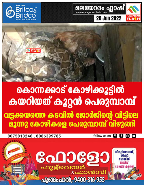 കൊന്നക്കാട് കോഴിക്കൂട്ടിൽ കയറിയത് കൂറ്റൻ പെരുമ്പാമ്പ് വട്ടക്കയത്തെ കടവിൽ ജോർജിന്റെ വീട്ടിലെ മൂന്നു കോഴികളെ പെരുമ്പാമ്പ് വിഴുങ്ങി