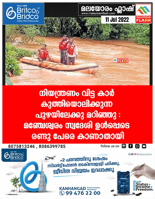 നിയന്ത്രണം വിട്ട കാർ കുത്തിയൊലിക്കുന്ന പുഴയിലേക്കു മറിഞ്ഞു : മഞ്ചേശ്വരം സ്വദേശി ഉൾപ്പെടെ രണ്ടു പേരെ കാണാതായി