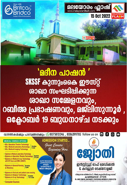 "മദീന പാഷൻ " SKSSF കുന്നുംകൈ ഈസ്റ്റ് ശാഖാ സംഘടിപ്പിക്കുന്ന ശാഖാ സമ്മേളനവും, റബീഅ പ്രഭാഷണവും, മജ്ലിസുന്നൂർ , ഒക്ടോബർ 19 ബുധനാഴ്ച നടക്കും