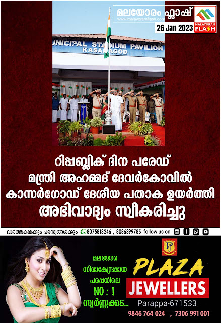 റിപ്പബ്ലിക് ദിന പരേഡ് മന്ത്രി അഹമ്മദ് ദേവർകോവിൽ കാസർഗോഡ് ദേശീയ പതാക ഉയർത്തി അഭിവാദ്യം സ്വീകരിച്ചു