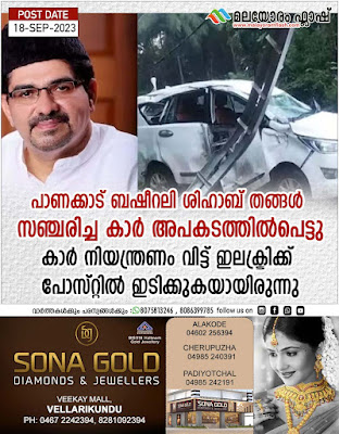 പാണക്കാട് ബഷീറലി ശിഹാബ് തങ്ങൾ സഞ്ചരിച്ച കാർ അപകടത്തിൽപെട്ടു